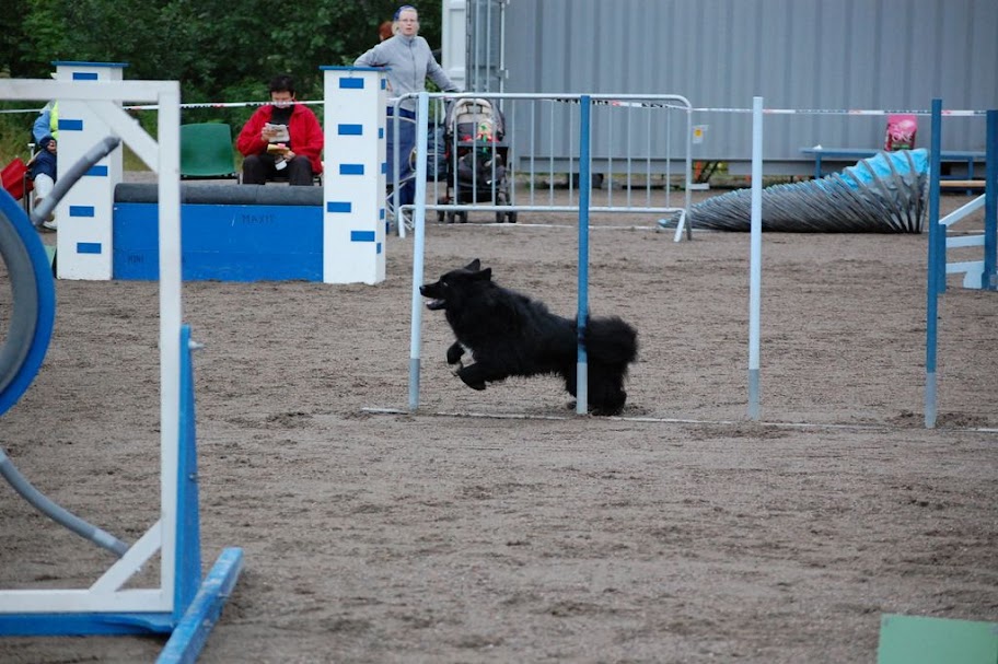 Alokasluokkaan osallistui 17 koirakkoa, joten ryhmäliikkeet tehtiin 3 ryhmässä. Mette oli toisen ryhmän viimeisenä. Helteestä huolimatta Mette oli reipas eikä edes läähätellyt pahasti. Sain pidettyä Meten aika viileänä, kun häkki oli varjossa ja froteemantteli Meten niskassa. Koepaikkahan oli urheilukenttä, joten kuumuus kehässä oli taattu! Meidän ryhmän paikkamakuut sujuivat hyvin, vaikka himpun verran jännittikin aamuisen episodin jälkeen. Paikkamakuun jälkeen mun jännityskin katosi, Mette tuntui olevan hyvin mukana ja kivalla asenteella! Paikkamakuiden jälkeen saatiin taas odotella aika kauan, kun Mette oli vasta 12 suoritusvuorossa. Siinä välissä käytinkin Meten uimassa ja sen jälkeen se sai makoilla häkissään.